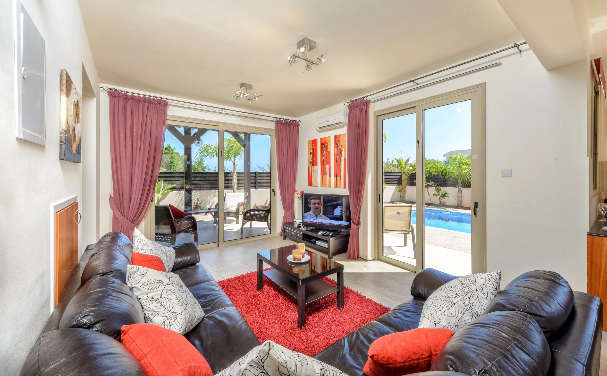 The open plan kitchen and dining area is well equipped with everything you need to prepare full meals. A floor standing water cooler means there is no purchasing of water necessary. Villa Andreas also has a fantastic sunny back patio which is surrounded by scented flowering shrubs and is ideal for eating outside. It is next to the kitchen patio doors making it easy to serve food. Great for sunny breakfasts, afternoon teas and dining on those hot summer nights; as it has outside lighting in the surrounding vegetation. These are blue and green LED lights and colour changing mood lights that make the outdoor space look very pretty.